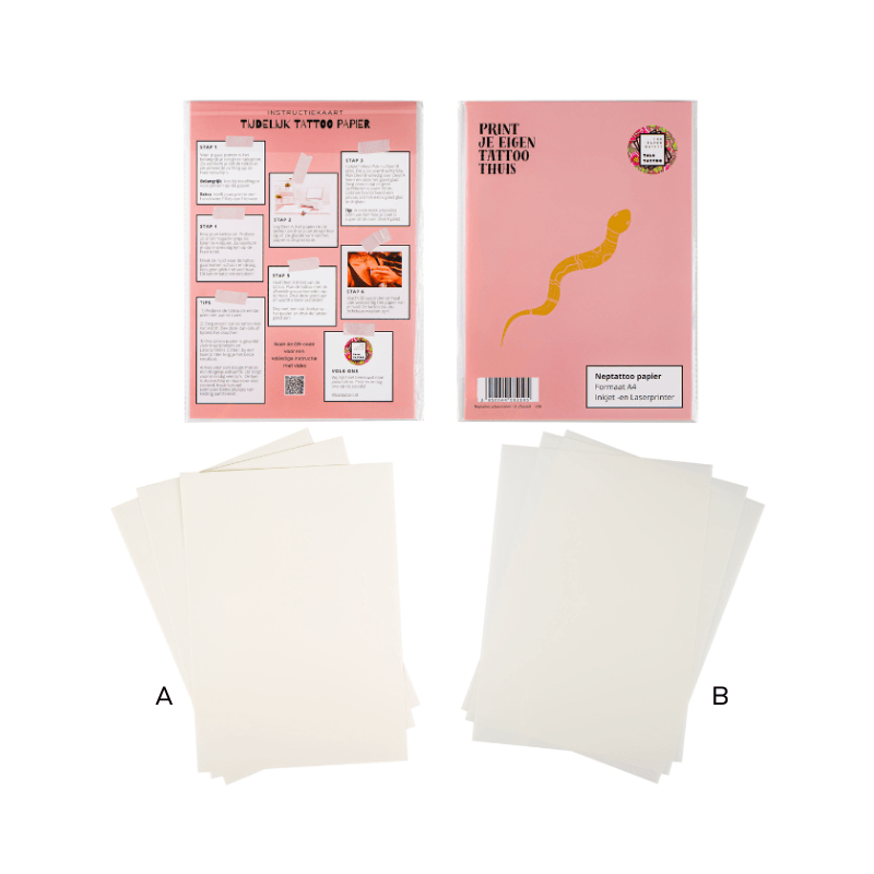 - Deel A: het tijdelijke tattoo papier (dit gaat in de printer voor het ontwerp)